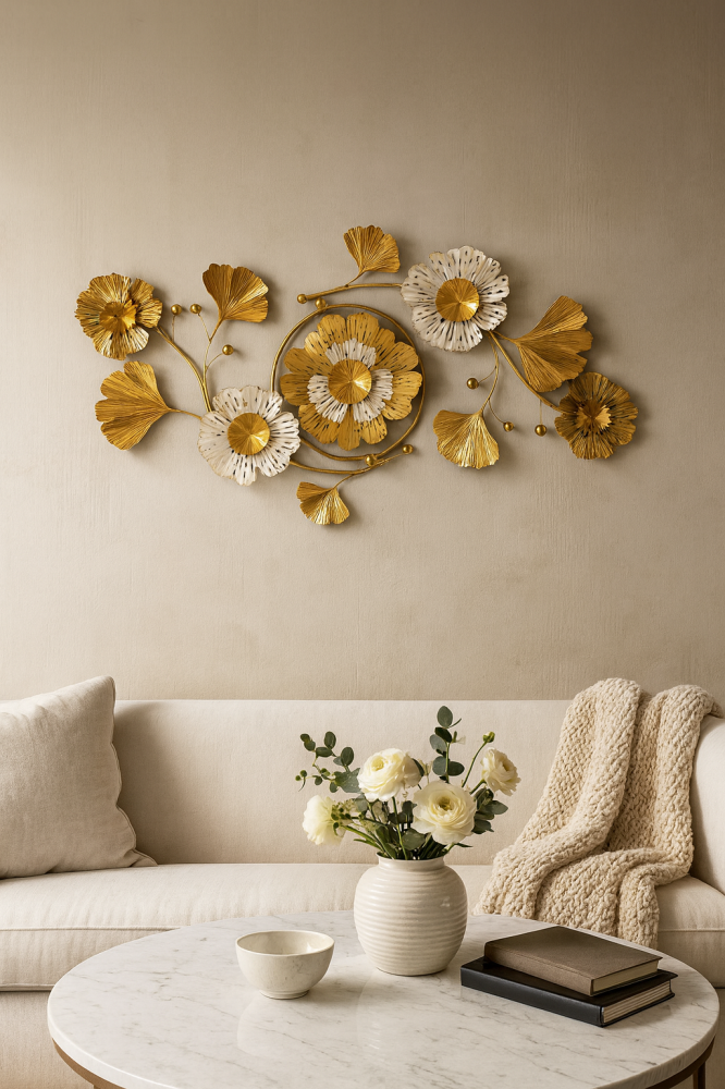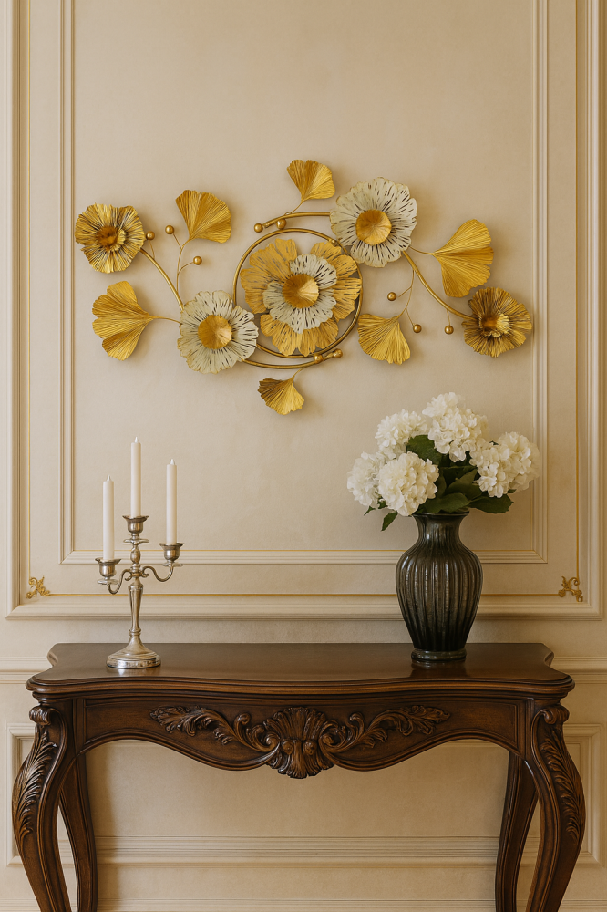 يتميز الديكور الجداري بأنه يضيف لمسة من الجمال والأناقة إلى أي مساحة يوضع بها، و يستخدم كعنصر ديكوري مميز يلفت الأنظار ويعبر عن ذوق صاحب المساحة ، وهو ديكور معدني يتم تركيبه على الجدار ليعطي فخامة و جمال للمكان ، وهو ذو لون ذهبي لامع و لون سكري .
