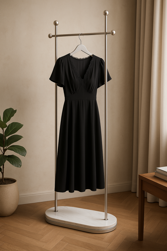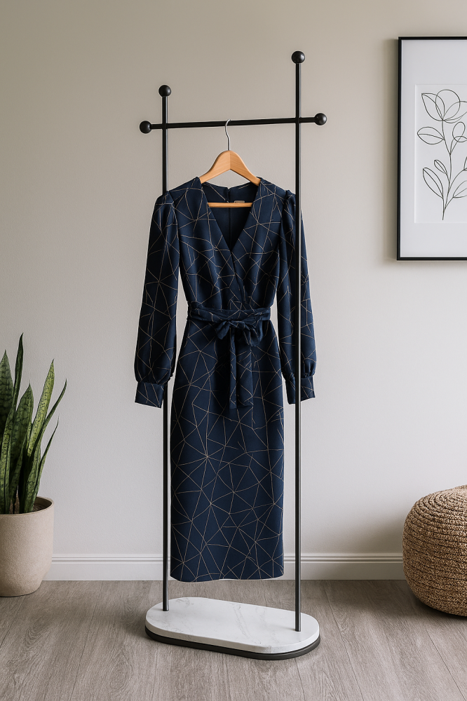 علاقة الملابس هي طريقة أنيقة وعصرية لتعليق ملابسك. يتميز بهيكل معدني قوي مع قاعدة خشب أبيض بشكل رخامية أنيق لمزيد من الثبات. يمكن أن تستوعب هذه الشماعة ما يصل إلى أكثر 20 قطع من الملابس، لذا فهي مثالية لتعليق مجموعة من العناصر من الفساتين والحقائب وغيرها.