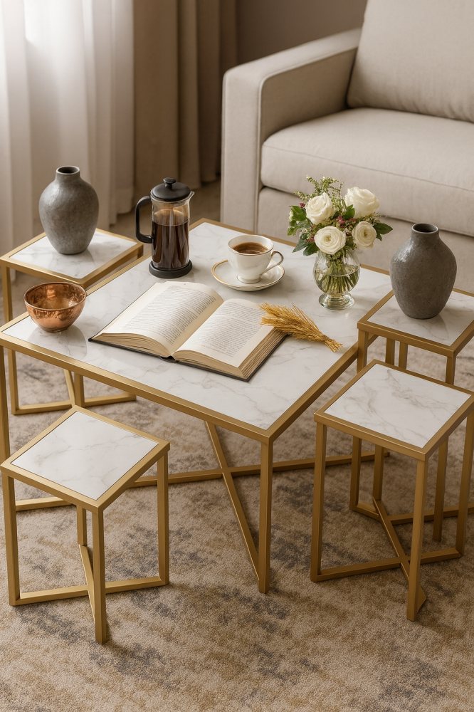 طاولة ضيافة كبيره مع أربع طاولات خدمة ، معدن الأرجل حديد مطلي ببوية الفرن و الرف يتكون من الخشب و شكله يكون حسب اختيارك.