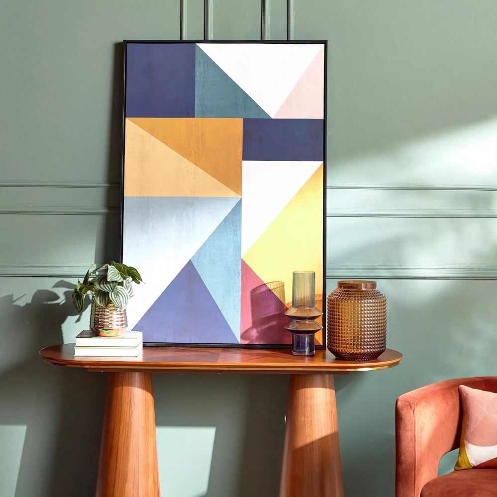 أبهري زوّاركِ بديكور جدران غرفة معيشتكِ باقتناء زينة الحائط الرّاقية هذه. تعرض تصميما مميزا لأشكال هندسية تُضفي جمالًا على ديكور الغرفة ، اللوحة تمت بالطباعة و بالرسم اليدوي ، وهناك بروز للألوان ليظفي طابع جميل للوحة ، وهي ذات حجم كبير لتضفي على غرفتك الفخامة.