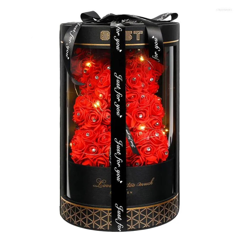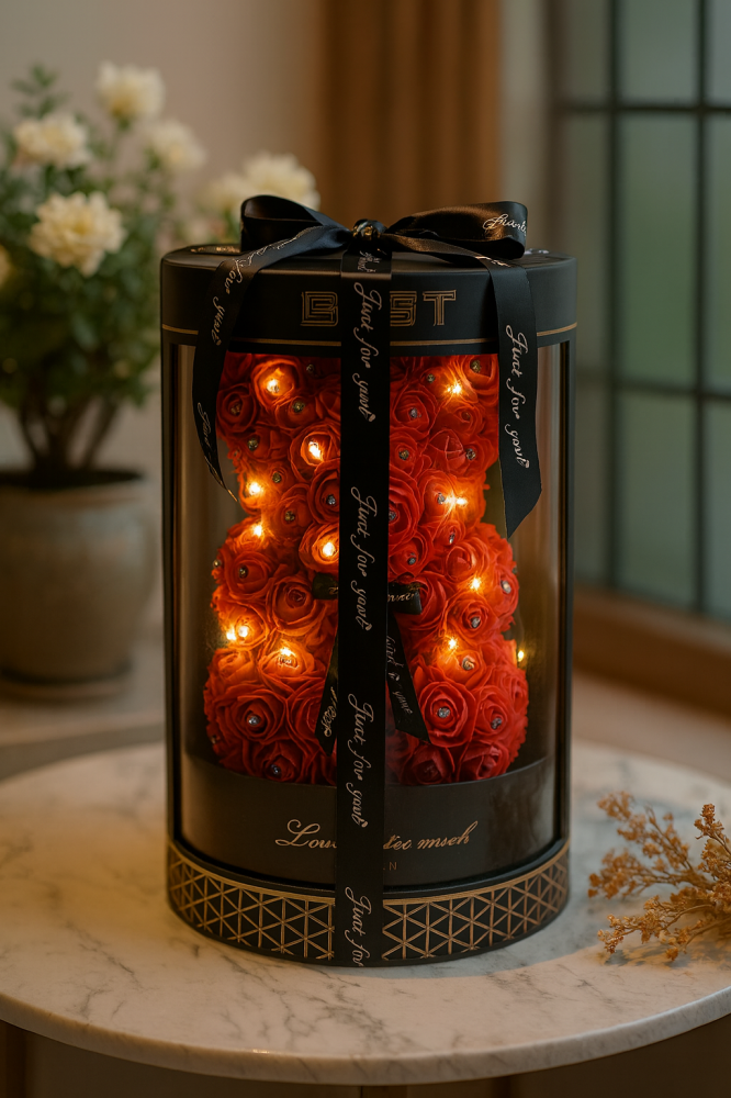 دمية دب مصنوعة من الورد الصناعي بلون أحمر ، تعليقة مثالية خفيفة الوزن وتدوم طويلاً لأي منزل ، صناعة يدوية، زهور صناعية مصممة كي تدهش شخصيتك المهمة ، مع علبة شفافة فاخرة كون غلاف للدمية بطريقة أنيقة للغاية لشخص مميز يجعل هذه الهدية أكثر مثالية .
