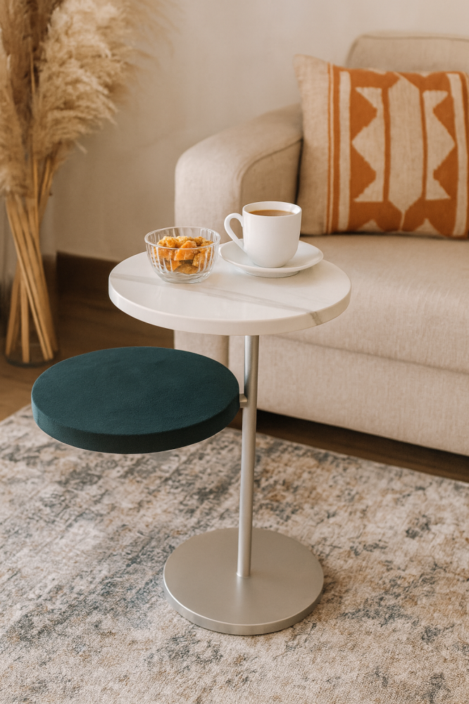 An elegantly designed coffee table suitable for use as a decorative or serving table. The top shelf is made of white marble wood and the second shelf is made of black velvet.