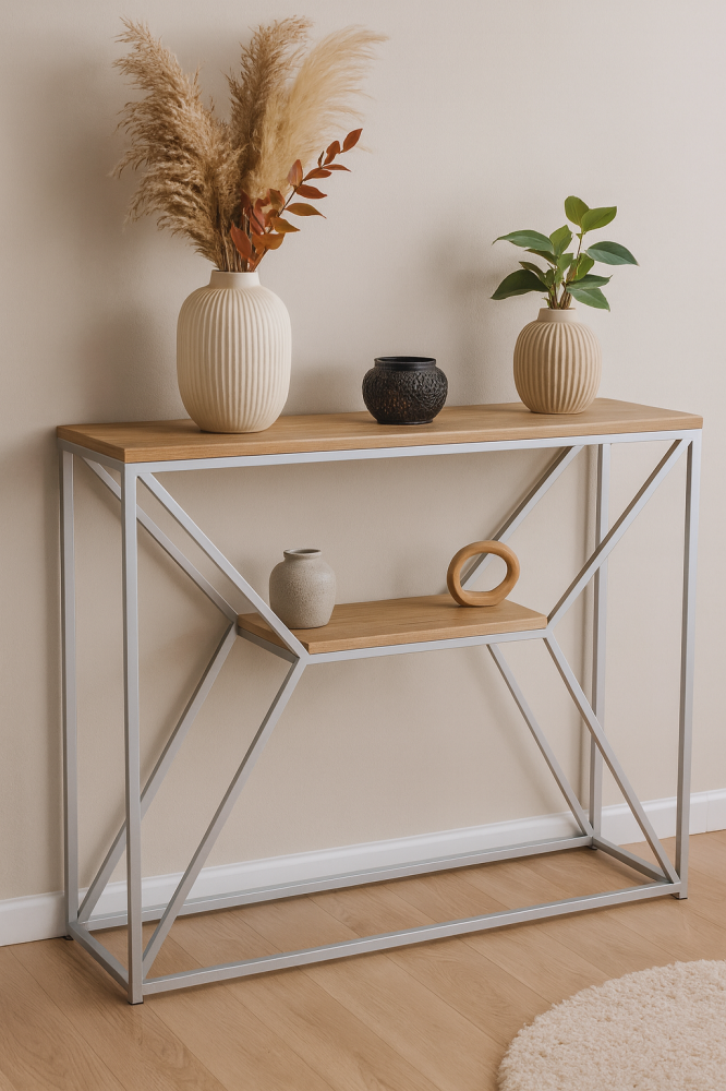 Console table: Enhance the elegance of your home's furniture with this unique table, designed with a luxurious modern style and crafted from high-quality materials to ensure durability and longevity. Two wooden shelves.