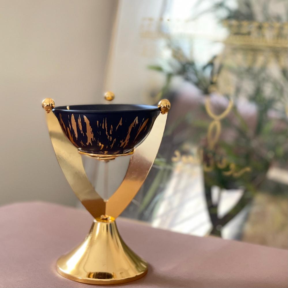 A metal incense burner in gold with black or gold with green , designed from the finest metal, giving the incense burner a valuable and elegant appearance, with a modern shape and a handle different from the usual shape, adding more beauty to it.