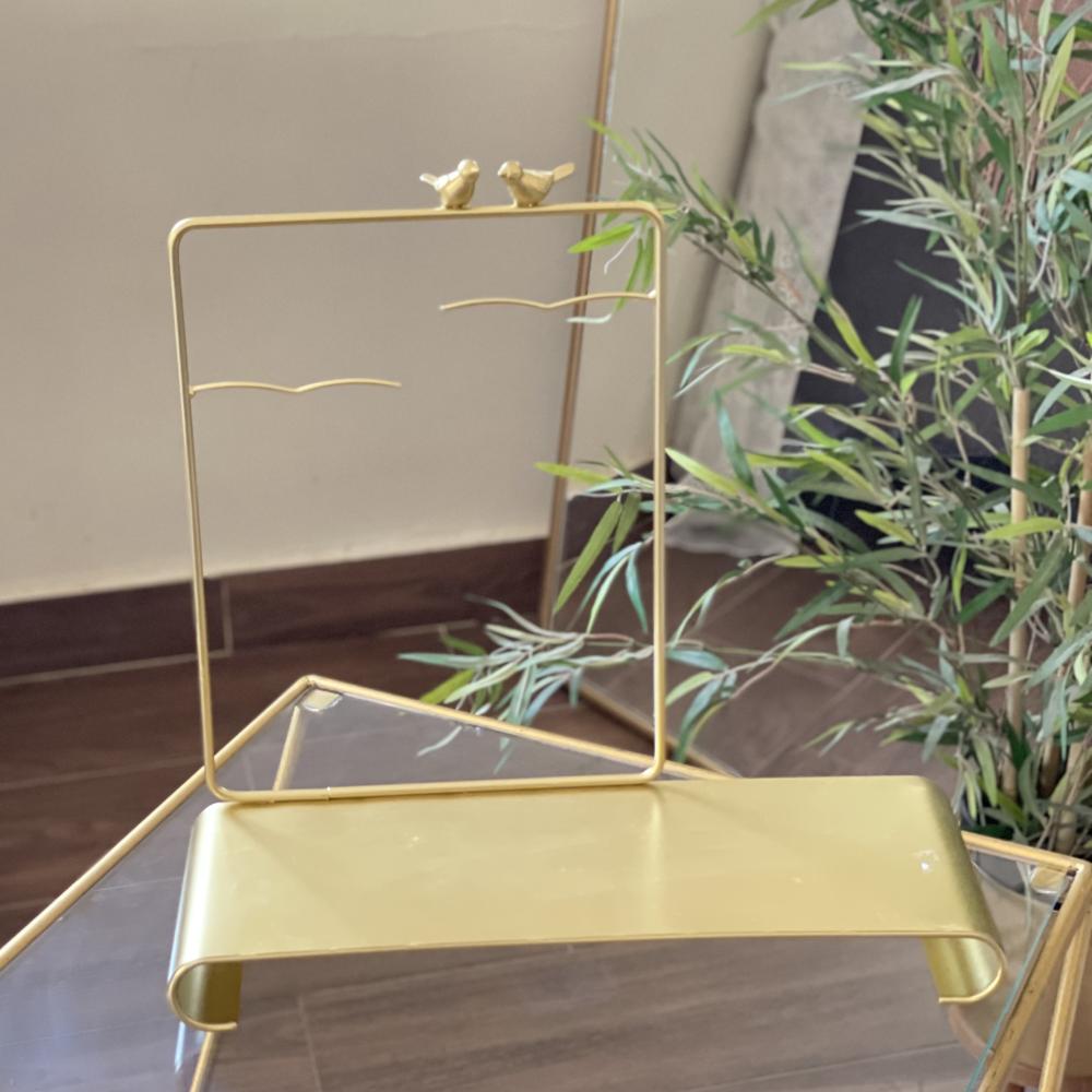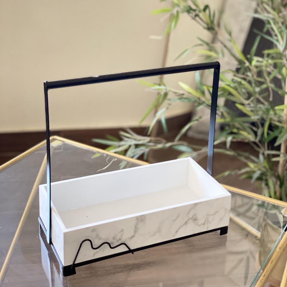 A stand for placing and presenting gifts. It has multiple uses. It is available in two shapes, as shown in the pictures: white wood with a marbled appearance, and the other is gold-colored metal.