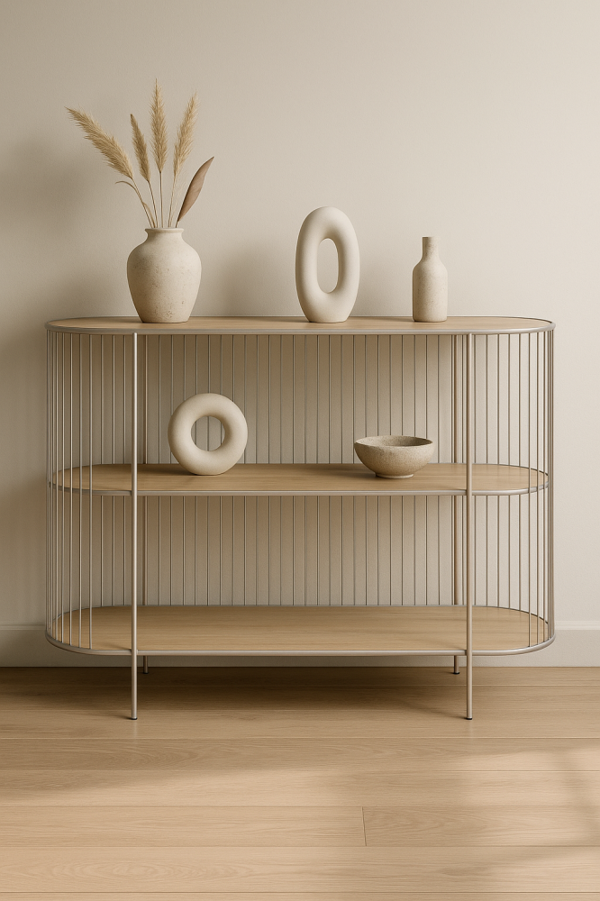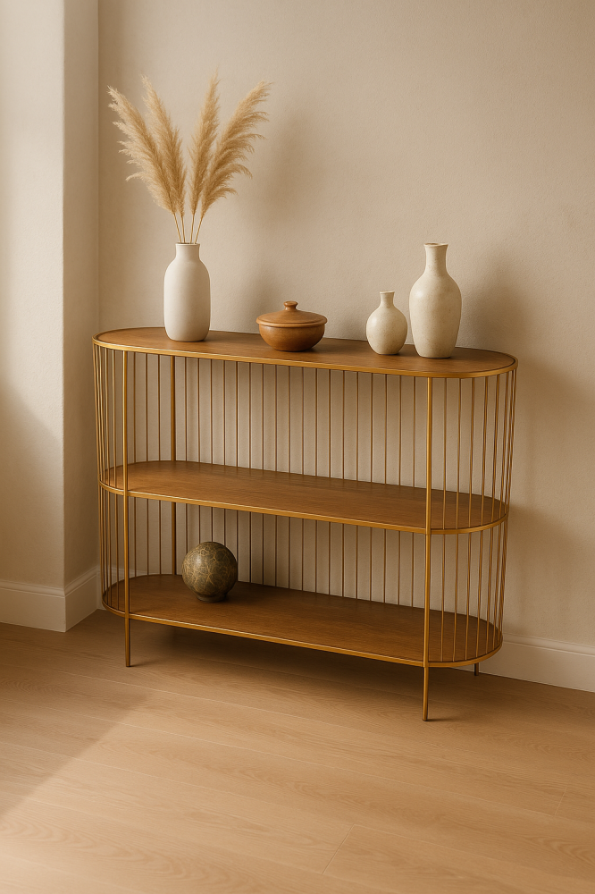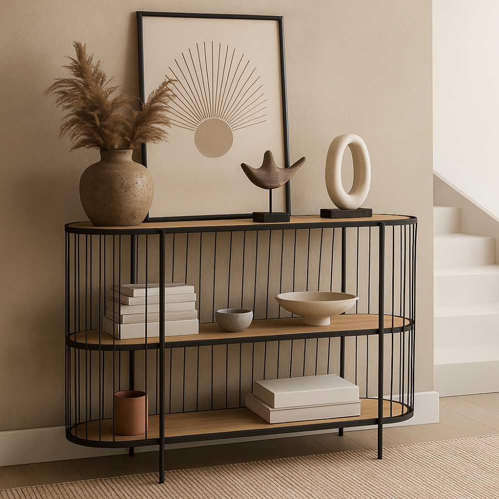 Add an elegant touch to your home entrance with this wonderful entrance table, with a distinctive design and a solid metal frame. Made of high-quality materials to ensure sustainability and durability. The product is the table alone.